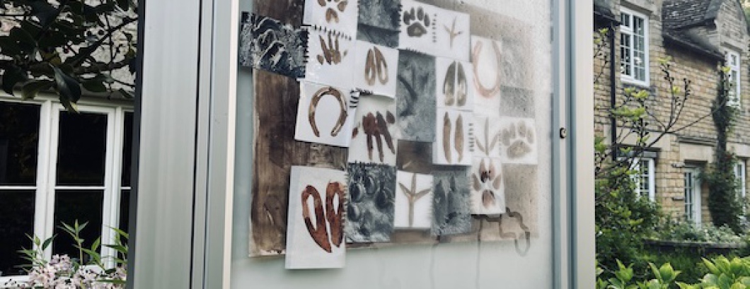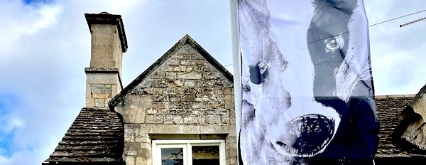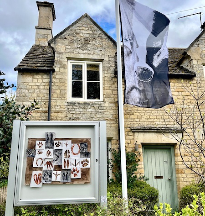 In April 2025 I exhibited two pieces at The Notice Board, curated by Kate Genever in Lincolnshire. Alphabet, a hand-stitched work, incorporating drawings with botanical inks, and photographs, of bird, mammal and human footprints, and Still a Badger Boy, a flag printed with a digital image created using multiple overlaid photographs of my face and a badger mask.